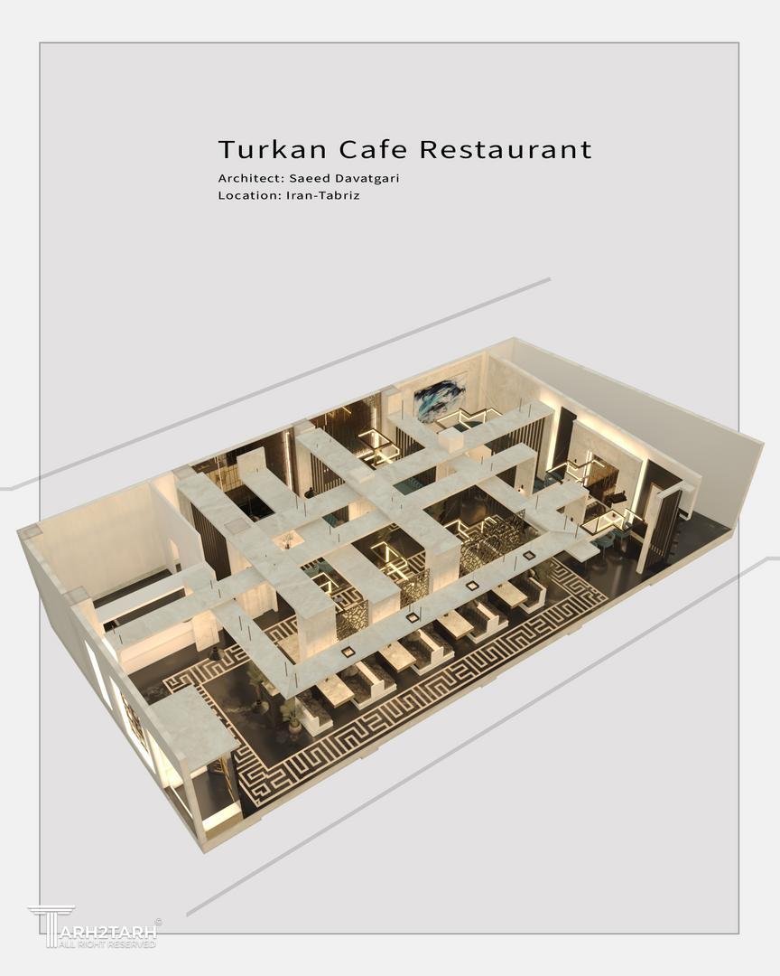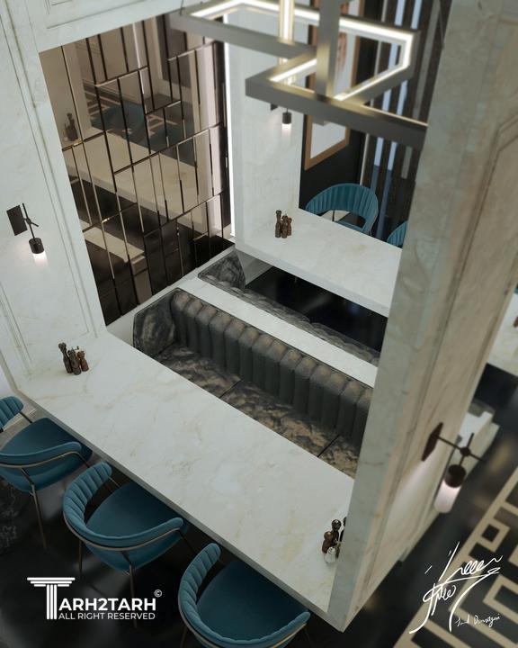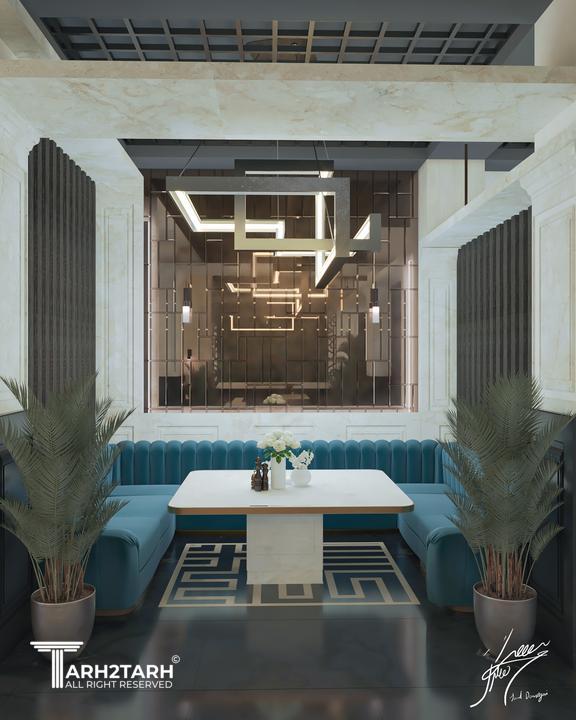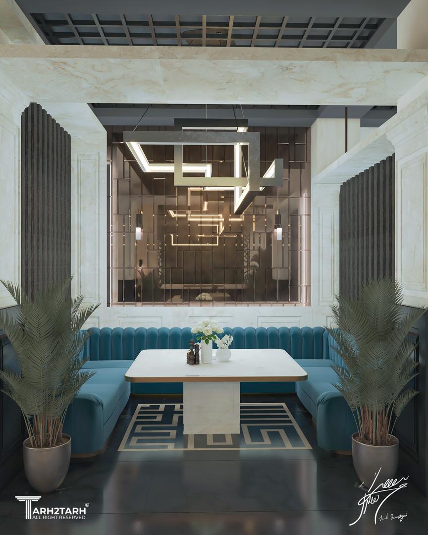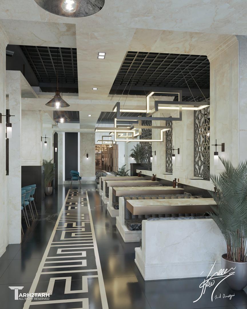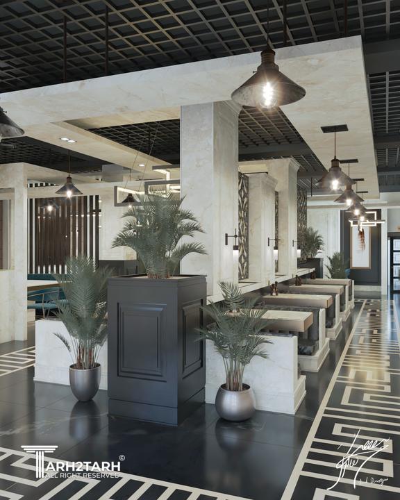 طراحی این کافهرستوران بر پایهی ترکیب ظرافت مدرن و الهام از الگوهای کلاسیک شرقی شکل گرفته است. استفاده از خطوط هندسی منظم در کف و سقف، همراه با رنگهای خنثی و متریال سنگ و فلز، فضایی منسجم و باوقار ایجاد کرده است. فرم کلی فضا از نظم هندسی و تکرار الگوها پیروی میکند تا حس هماهنگی و تعادل را القا کند. نورپردازی خطی و معلق در سقف، علاوه بر تأکید بر محوریت فضا، حس معاصریت و پویایی را وارد محیط کرده است. بهطور کلی، این فضا تلاش دارد تجربهای آرام، لوکس و در عین حال صمیمی را برای مهمانان فراهم آورد.