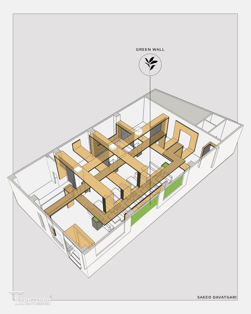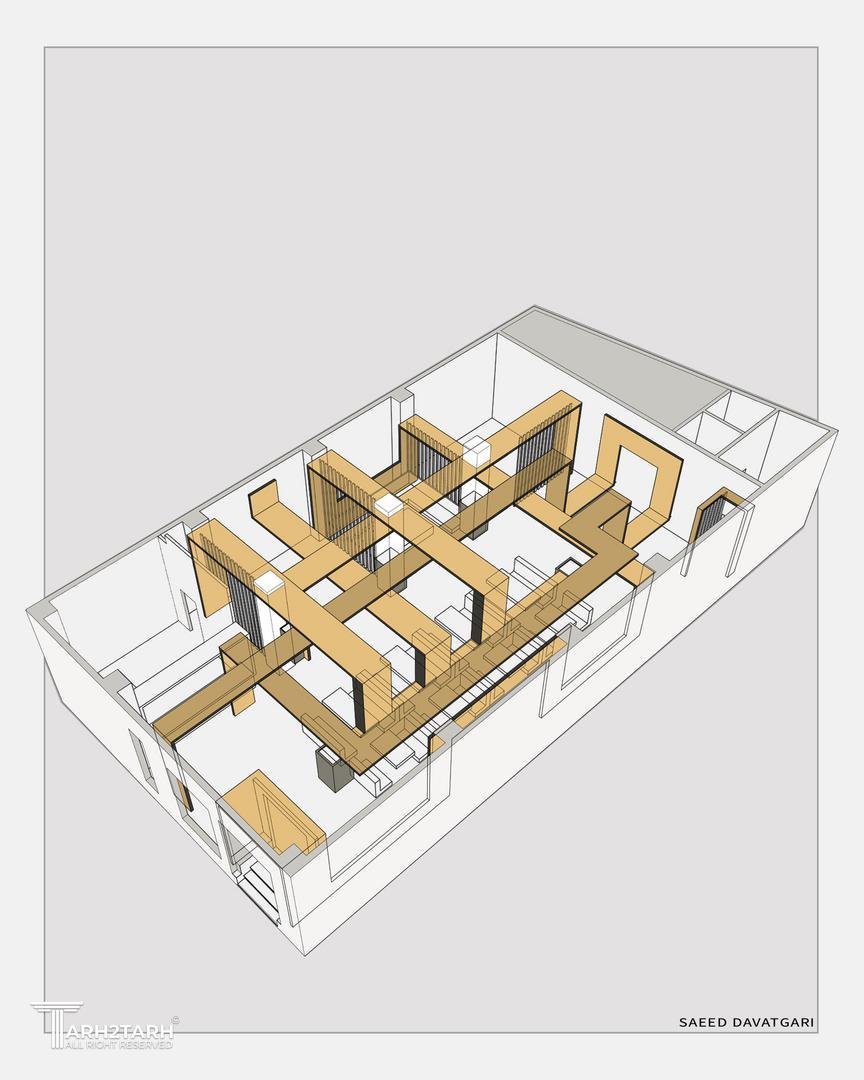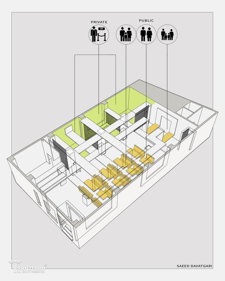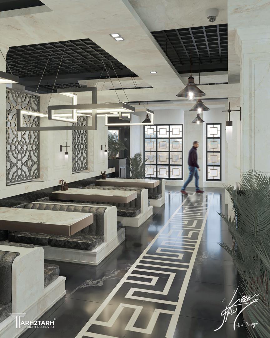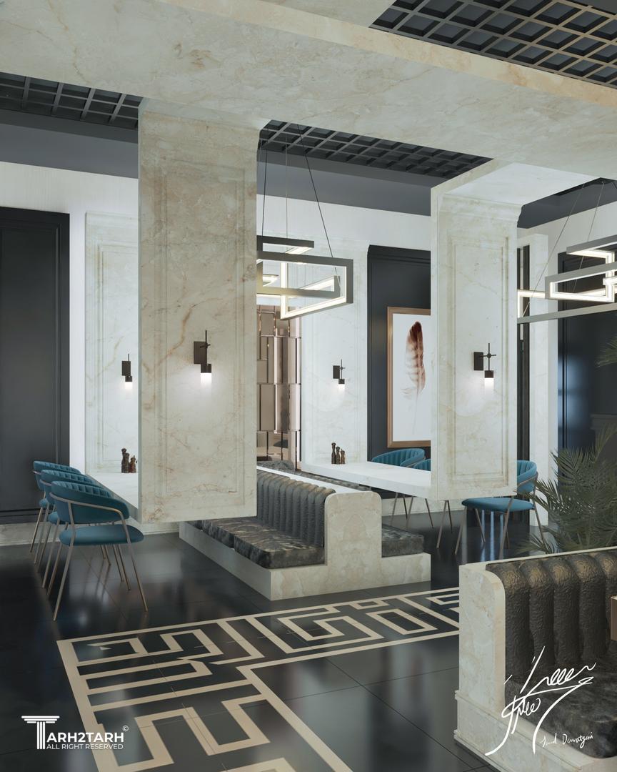 طراحی این کافهرستوران بر پایهی ترکیب ظرافت مدرن و الهام از الگوهای کلاسیک شرقی شکل گرفته است. استفاده از خطوط هندسی منظم در کف و سقف، همراه با رنگهای خنثی و متریال سنگ و فلز، فضایی منسجم و باوقار ایجاد کرده است. فرم کلی فضا از نظم هندسی و تکرار الگوها پیروی میکند تا حس هماهنگی و تعادل را القا کند. نورپردازی خطی و معلق در سقف، علاوه بر تأکید بر محوریت فضا، حس معاصریت و پویایی را وارد محیط کرده است. بهطور کلی، این فضا تلاش دارد تجربهای آرام، لوکس و در عین حال صمیمی را برای مهمانان فراهم آورد.